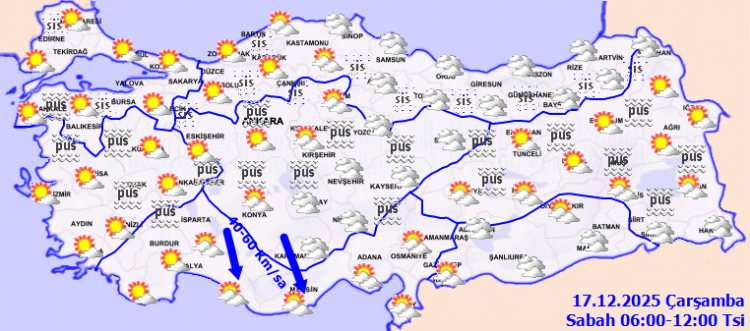 Sabah ve gece saatlerinde iç ve doğu kesimlerde hafif buzlanma ve don ile birlikte pus, yer yer sis hadisesinin görüleceği tahmin ediliyor.